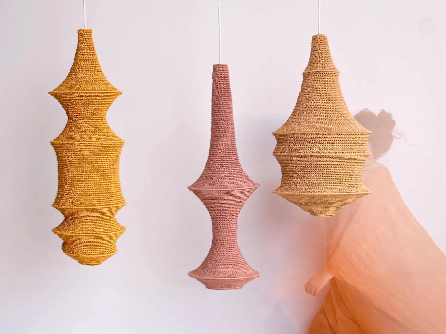 To reflect their origin, the sculptural shapes of the Malika pendants are inspired by objects used in daily Moroccan life, like tagines, baskets and pots. 'Malika' is the name of the beautiful woman that made our very first crochet pendant.